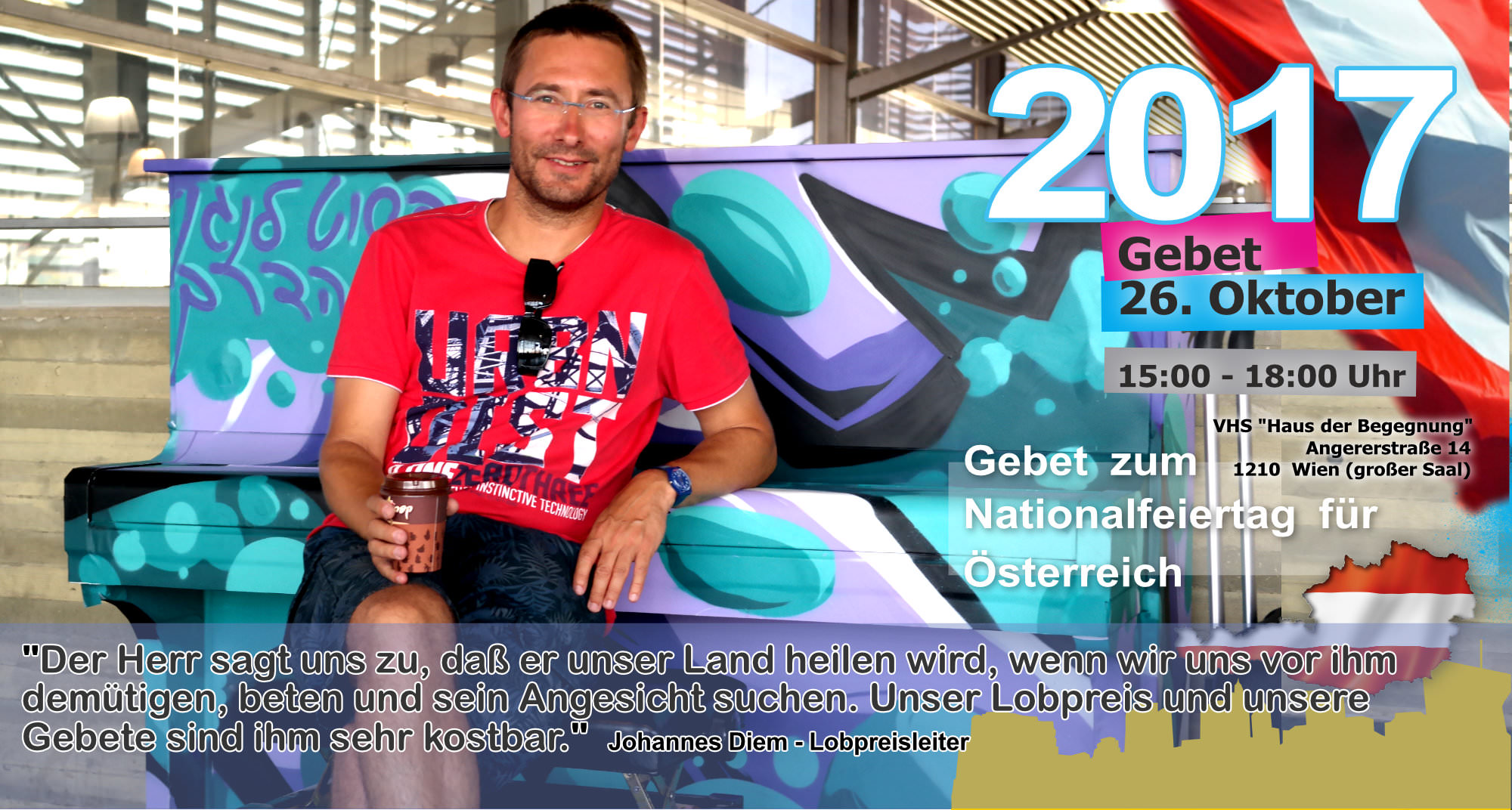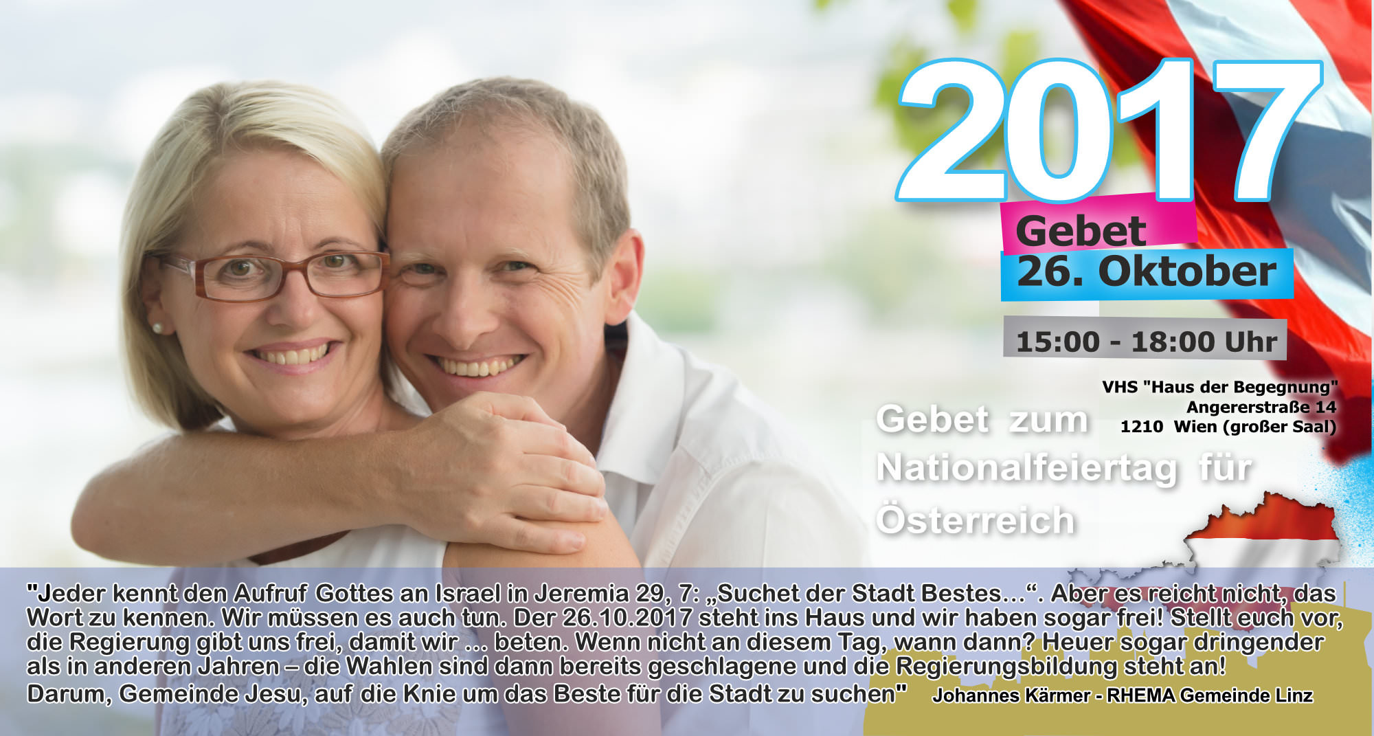 Treffpunkt: Stephansplatz - unter dem Motto "Suchet der Stadt Bestes" beten wir für "alle in Obrigkeit und Verantwortung" vor dem Rathaus, den Parteizentralen, am Heldenplatz, Parlament, Universität, aber auch gegen Antisemitismus (Judenplatz)